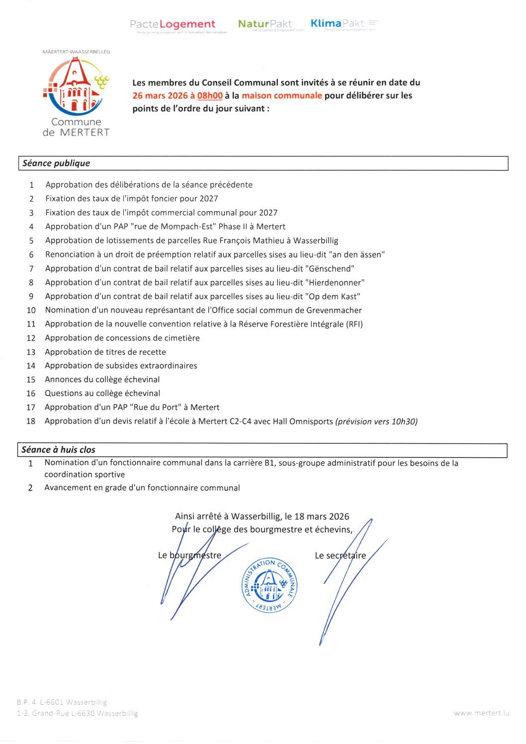 Conseil Communal le 26 mars 2026 à 8h00