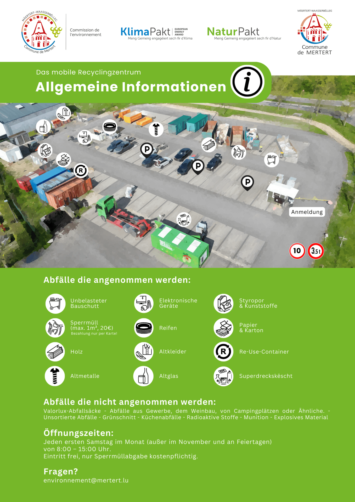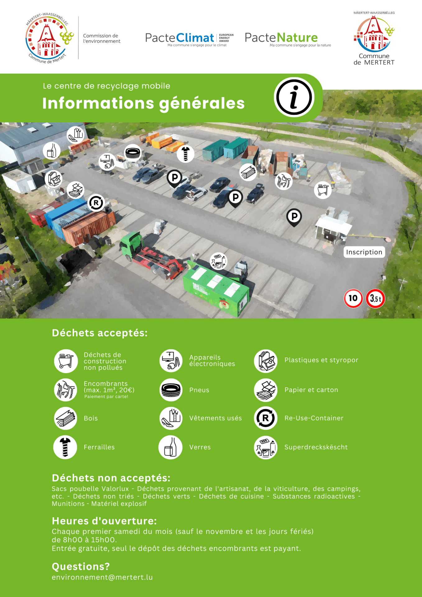 vous souhaitez recycler. L’utilisation est gratuite (sauf les encombrants: max. 1m³, 20€ – le payement est accepté que par carte bancaire).