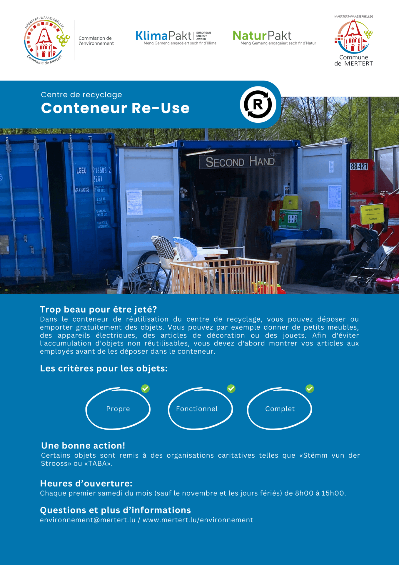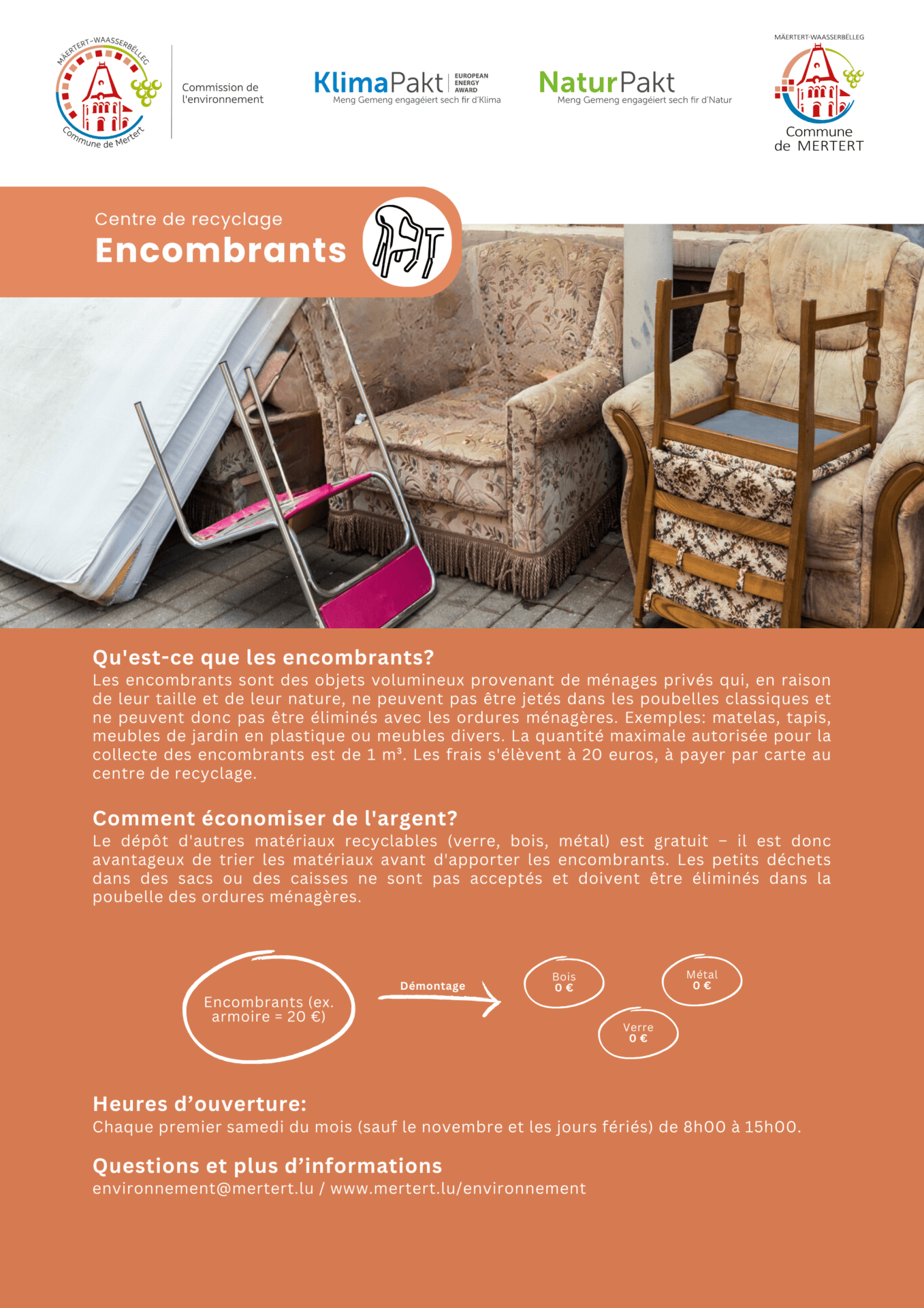 Chaque premier samedi du mois (sauf le novembre et les jours fériés) de 8h00 à 15h00. L’entrée est gratuite, seul le dépôt des déchets encombrans est payant (max. 1m³, 20€ – le payement est accepté que par carte bancaire).