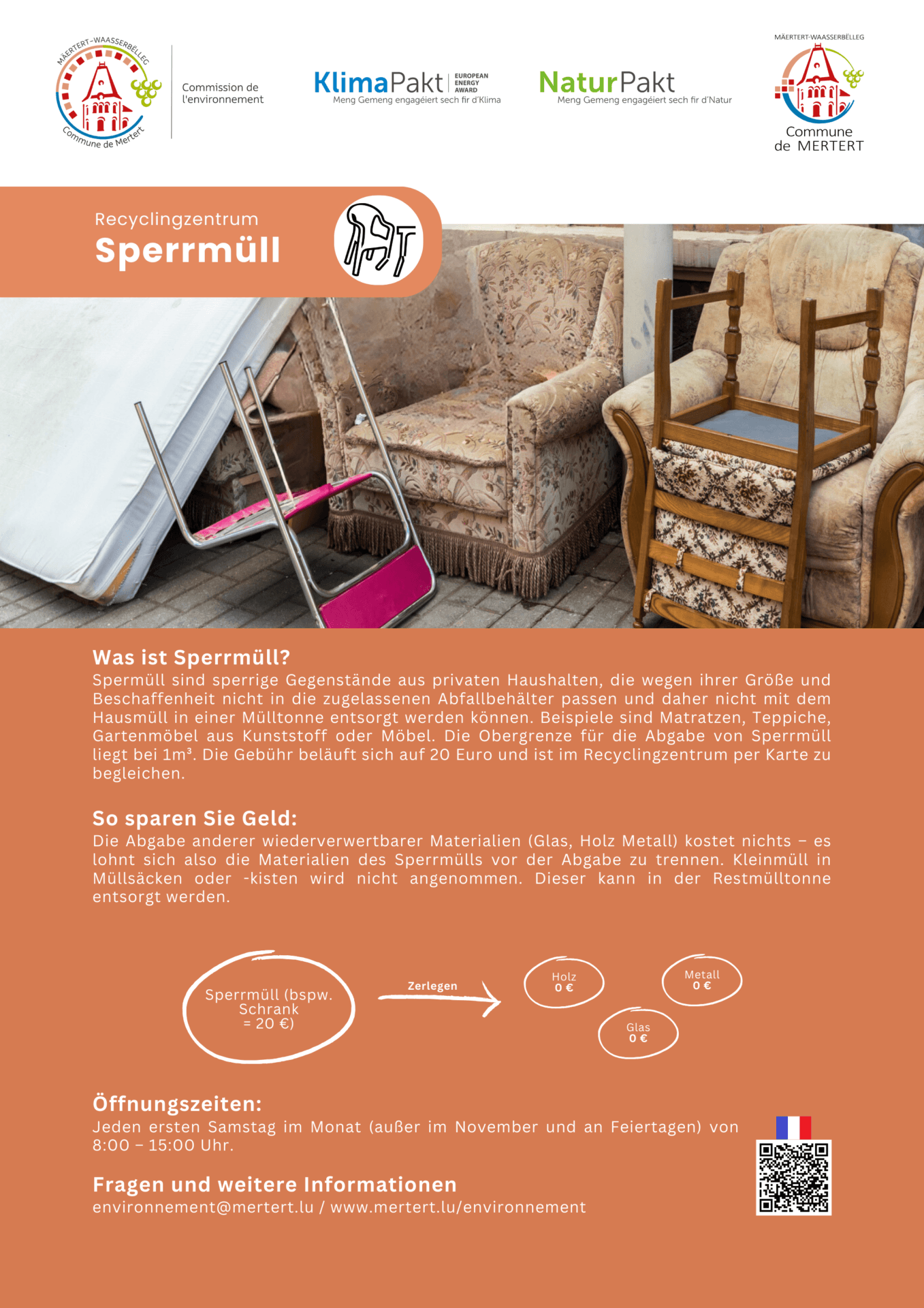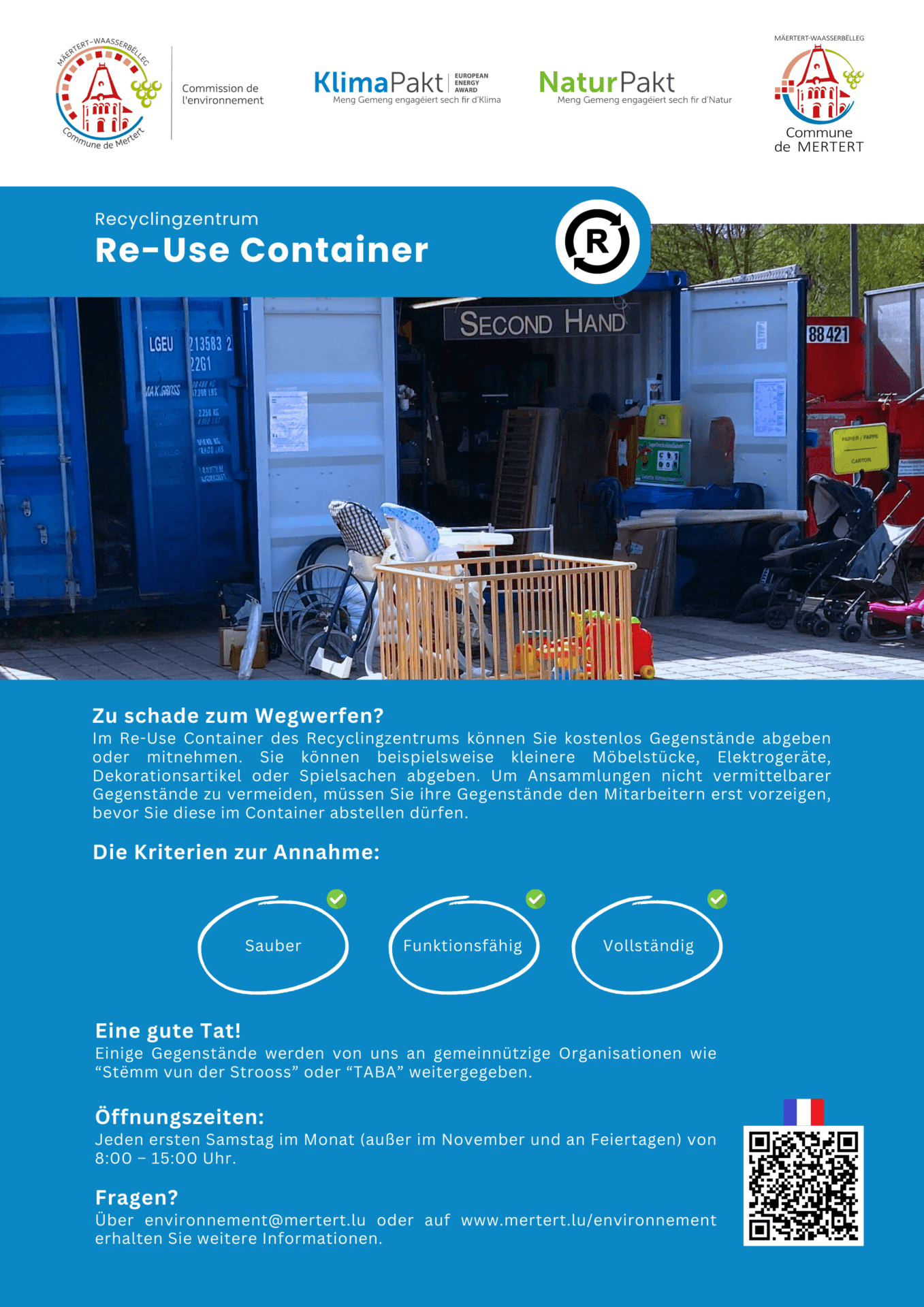 Jeden ersten Samstag im Monat (ausser im November und an Feiertagen) von 8h00 bis 15h00. Der Eintritt ist frei, nur die Abgabe von Sperrmüll ist kostenpflichtig (max. 1m³, 20€ – Zahlung nur per Bankkarte).